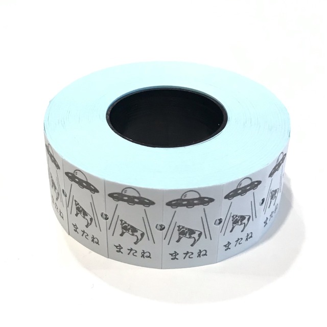 UFOに牛が連れ去られるワンシーンに「またね」のメッセージがシュールなラベラーロールシールです☆ たっぷり1000枚綴りなので、ラッピング、お手紙、手帳デコレーションに惜しみなくつかってくださいね。 ※こちらの商品はインクのかすれ、印刷のずれ、色味の個体差 テープ巻きのずれ、折れ、カットのずれなどが見られることがございます。 また、紙のつなぎ目には、剥離紙側にテープがついたものもございます。 本来の用途(値段付け用シール)とは異なるため、全て良品とさせていただきます。 こちらでも検品をし、販売できると判断したもののみをお送りします。 ご理解いただいた上でのご注文をお願いいたします。 ロール直径約5.5cm シール1片 H1.2cm W2.16cm 1000枚綴り(10枚ほど増減あり)