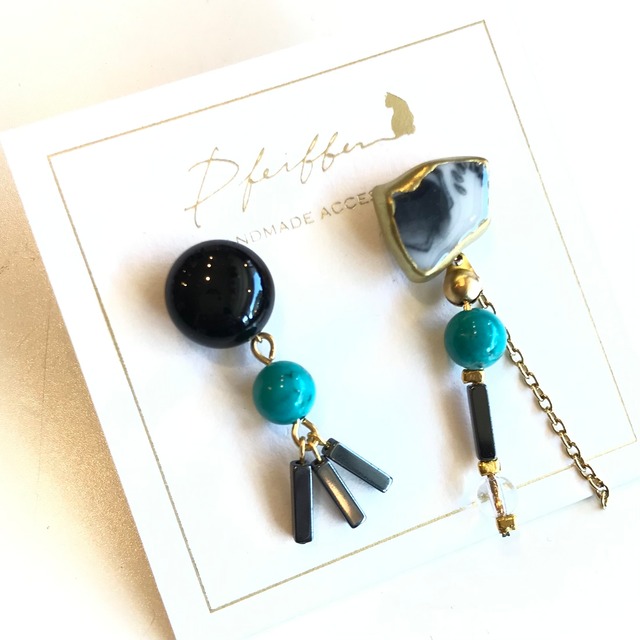 サイズ 約H3.2〜4.1cm 素材 シー陶器・ガラス・ターコイズ・ヘマタイト・クオーツ ピアス金具 サージカルステンレス シー陶器や天然石を使って製作された、すべて一点もののPfeifferの作品です☆ 素材の形を生かしたアシメントリーなデザインが個性的ながらも上品なアクセサリーに仕立てられています。 こちらは画像3.4枚目のようにトップ部分だけでも使える2WAYタイプのピアスです☆