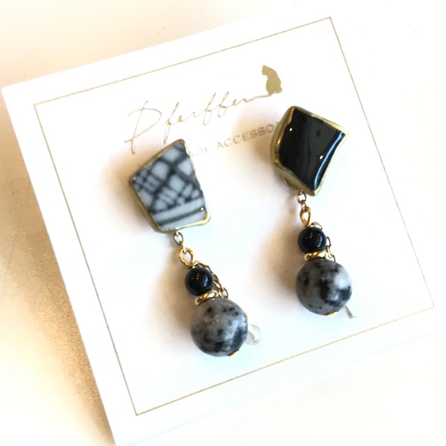 サイズ 約H3.0cm 素材 シー陶器・オニキス・クオーツ・セサミジャスパー ピアス金具 サージカルステンレス シー陶器や天然石を使って製作された、すべて一点もののPfeifferの作品です☆ 素材の形を生かしたアシメントリーなデザインが個性的ながらも上品なアクセサリーに仕立てられています。 こちらは画像3.4枚目のようにトップ部分だけでも使える2WAYタイプのピアスです☆