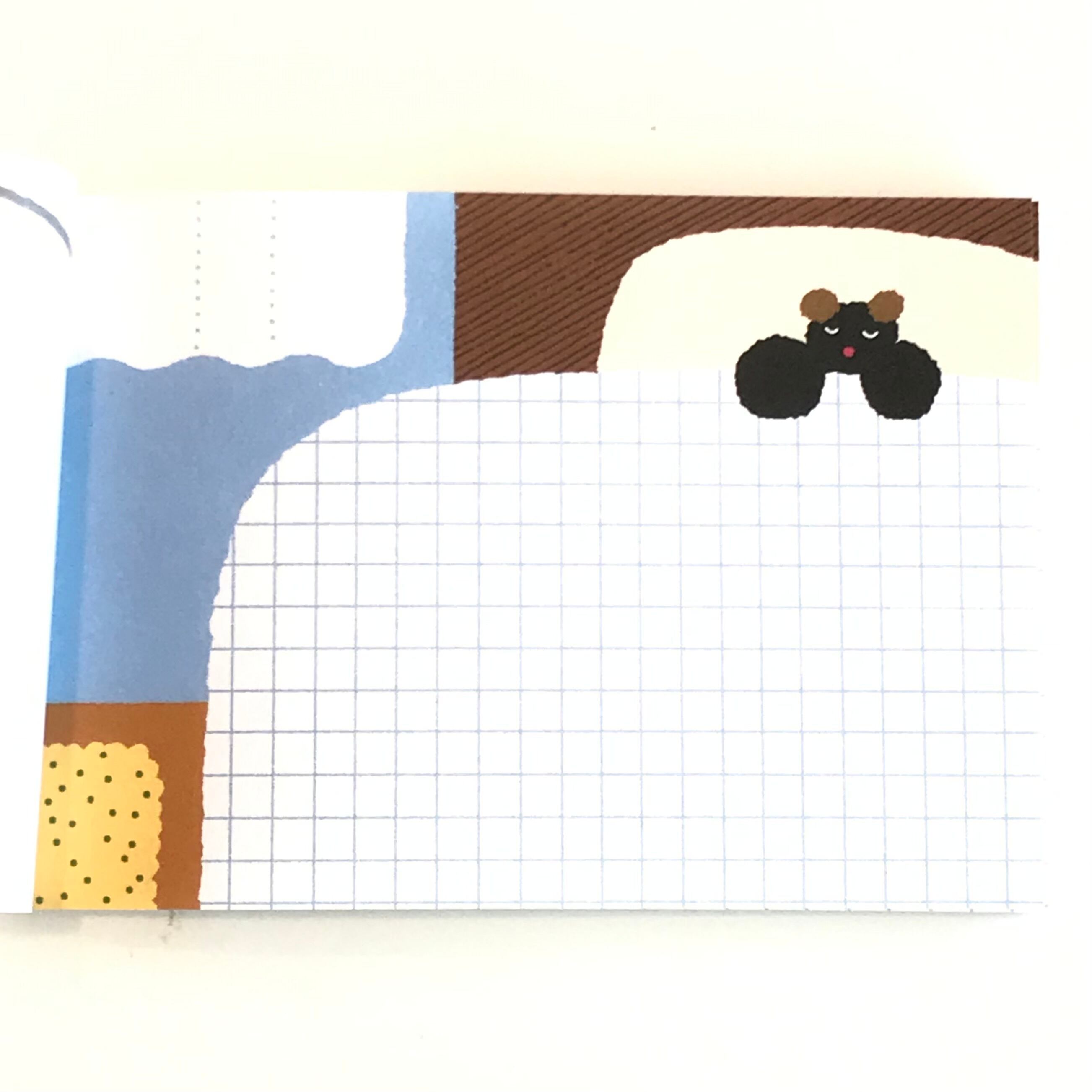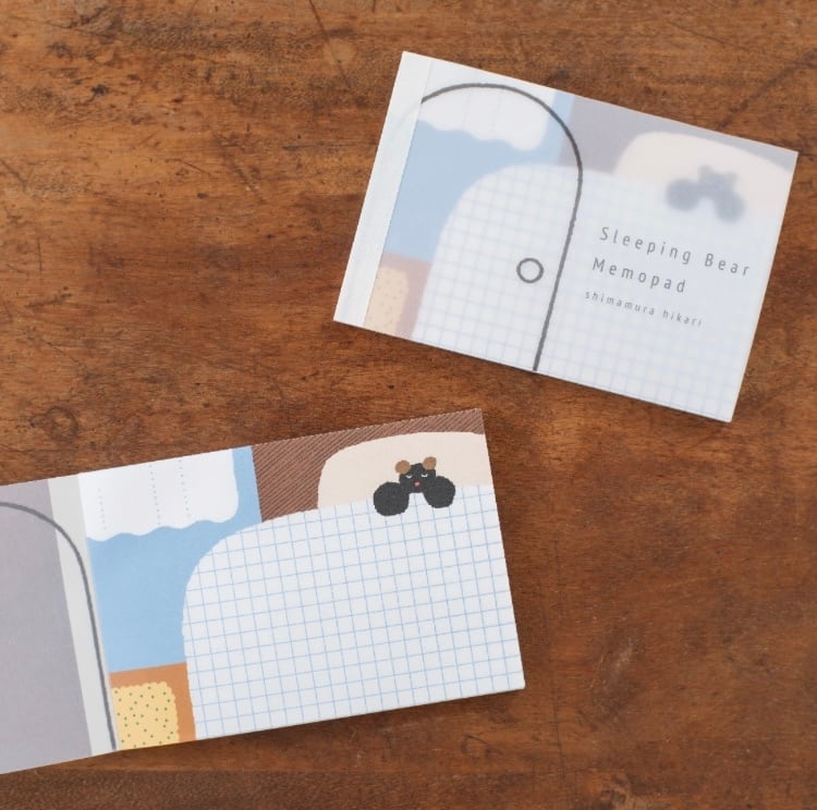 眠っているくまちゃんのベッドカバーが方眼模様になっており、文字も書きやすいのがポイントです。透けるトレーシングペーパーの表紙にはお部屋のドアが描かれていて、メモ本体に重なるとくまちゃんを見守っているような気持ちになれます。