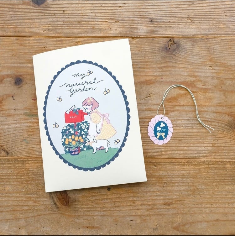 赤いポストの中をのぞく少女や、その様子を見つめる白いヤギ、庭に咲く草花がキュートに描かれた紙製のファイル。