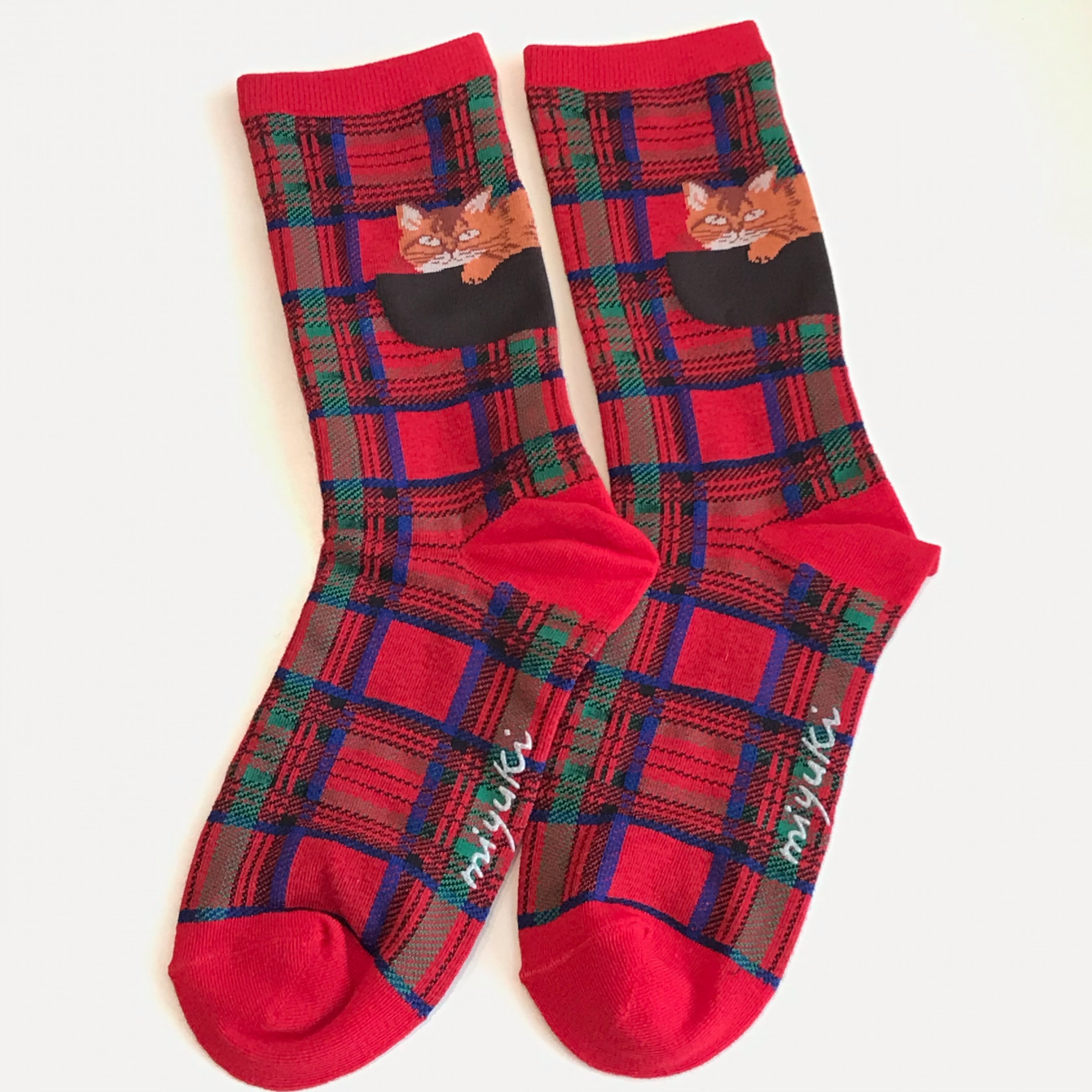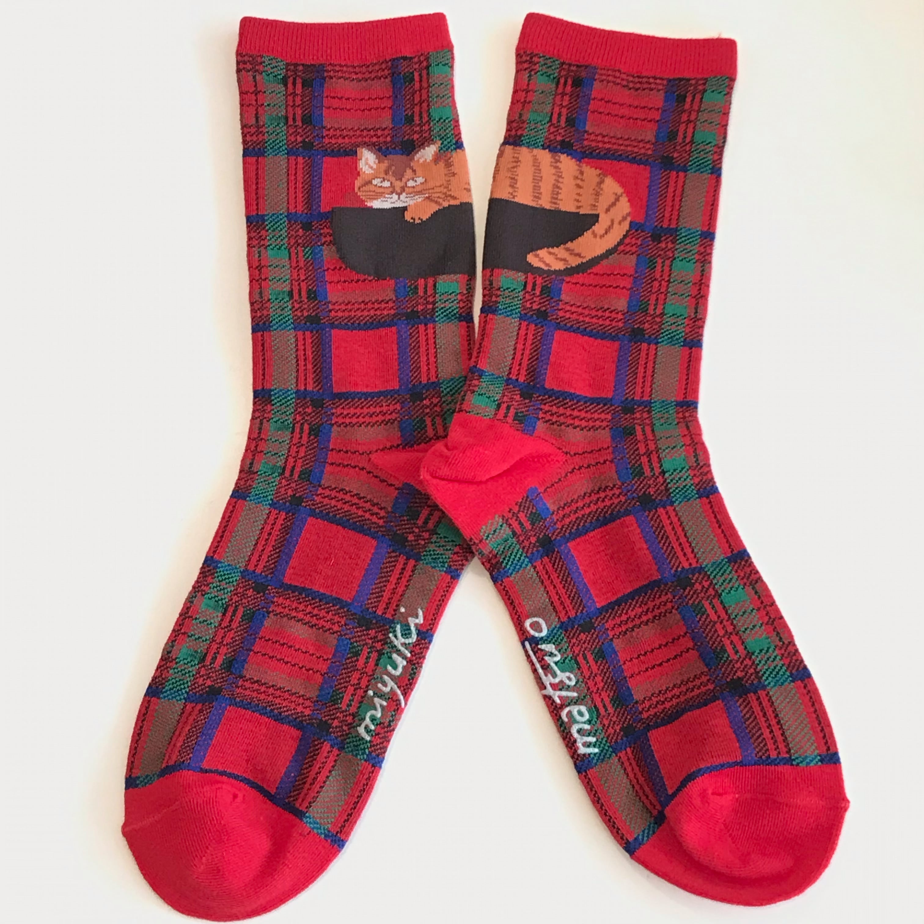 ネコたちが表情を添え、チェック柄とともに足元にアクセントを取り入れてくれます。