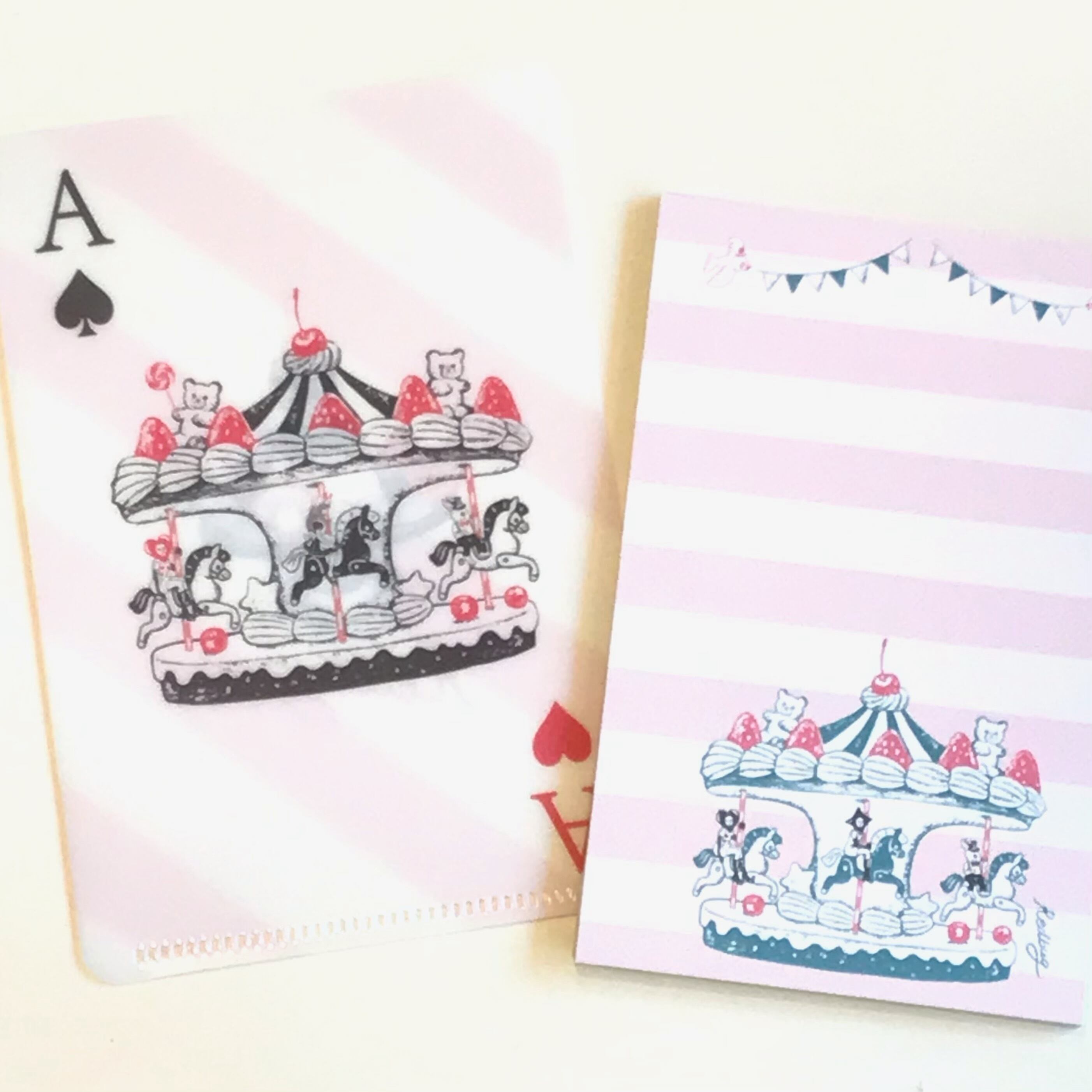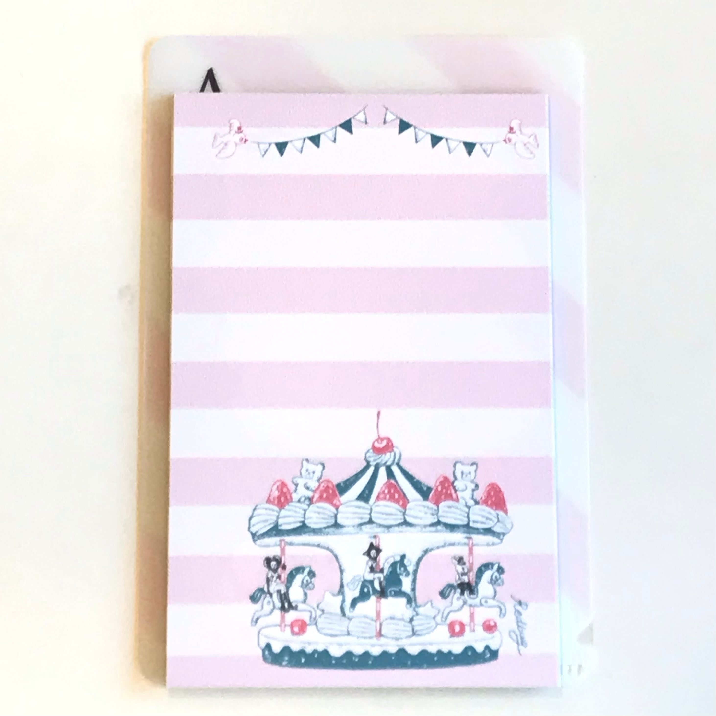「お菓子な遊園地」は、ケーキのメリーゴーランドや、ティーカップを楽しむくまさんやトランプの小人たちが、まるで絵本の1ページのよう。思わず顔がほころんでしまう、愛らしいイラストです。文字をたっぷり書き込めるデザインなのも嬉しいです。