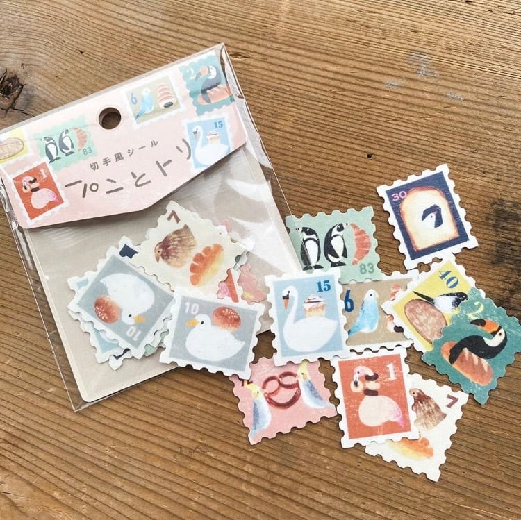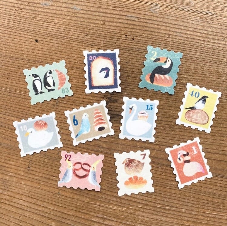 砂糖ゆきさんが描く、このまま切手としても欲しい...…!と、思ってしまう10羽の鳥が大集合したフレークシールです☆