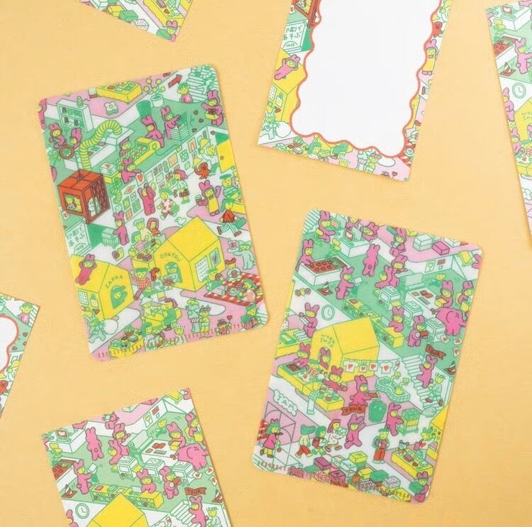 小さな世界観がぎゅっと詰まっていて、裏表で並べるとイラストがつながる仕様になっています。せっせとお仕事しているうさぎのきぐるみさんや、ワークショップを楽しむ人たち…。ひとりひとりをじっくり眺めているだけで、楽しい気分になる一枚です。