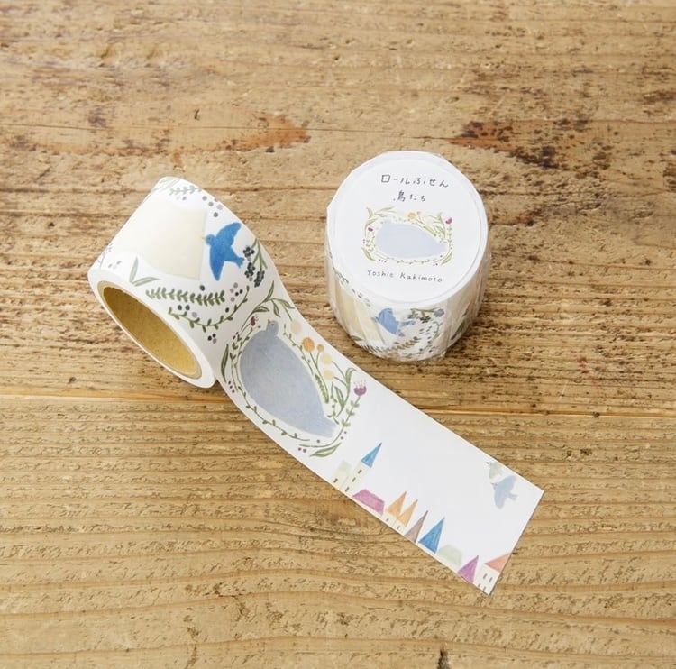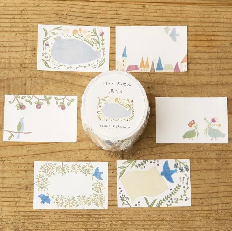 イラストレーターとして、書籍の装幀や広告ビジュアルなどで活躍する柿本芳枝さんのロール付箋☆ 飛んでいたり、花を加えていたり、木に止まっていたり、鳥をテーマに様々な場面が描かれています。
